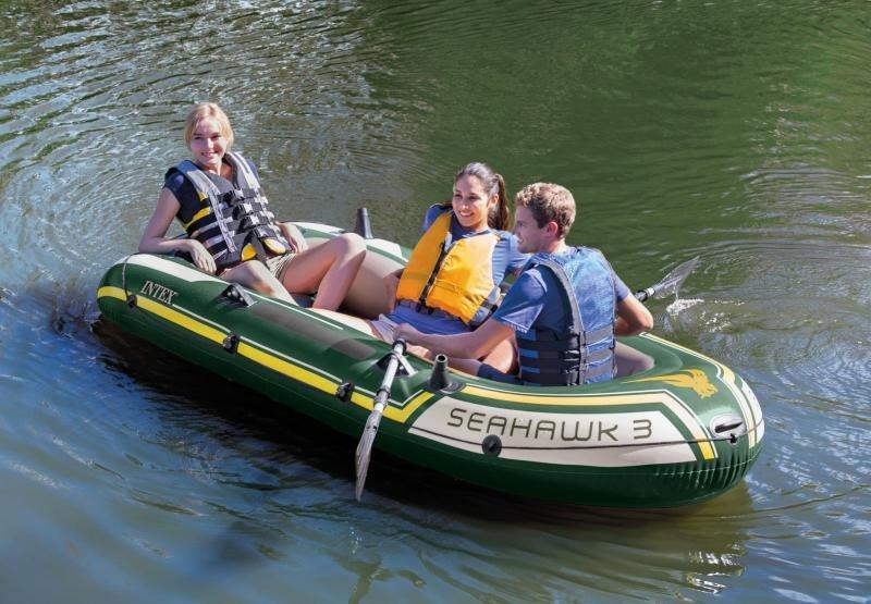 Je súprava nielen pre rybárov, ktorá ponúka miesto pre 3 osoby. Nafukovací čln Seahawk je zo športovej série Intex + hliníkové veslá a ručná pumpa 30cm. Ventil pre rýchle nafúknutie a vyfúknutie. Nafukovacia podlaha. Silné oká na veslá. Oko na ukotvenie člna. Oka na uchytenie motora. Vak na výbavu. Držiak rybárskeho prútu. Lana po obvode lode. Hrúbka stien 0,58 mm. Materiál PVC bez použitia ftalátov. Certifikát GS TÜV.Čln má maximálne zaťaženie do 360 kg. Veľkosť 295 x 137 x 43 cm ponúka dostatočný priestor. Táto loď má tri vzduchové komory, 2 veľké Boston ventily k rýchlemu nafúknutiu, 2 držiaky na prúty, držiak na podberák a prípravu na zapojenie motora.