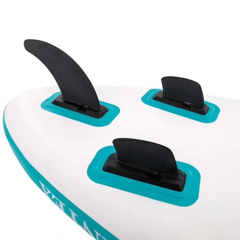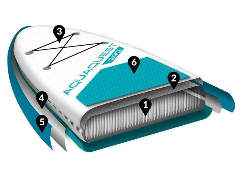 Paddleboard Intex AquaQuest není jen samotné prkno. Disponuje spoustou doplňků, které zpříjemní samotné pádlování i třeba přenos boardu. Pod elastické bungee šňůry můžete upevnit lehký náklad, který nechcete nechávat na břehu. Protiskluzová EVA podložka s texturovanou strukturou po téměř celé ploše prkna poskytne maximální bezpečí a minimalizuje riziko uklouznutí. Nemusíte se ale bát ani když k uklouznutí dojde. K noze a nerezovému D-kroužku jednoduše připevníte bezpečnostní leash a paddleboard vám nikam neuplave. Výhodou jsou také elastický latexový batoh pro snadné uschování i přenos paddleboardu po zakončení aktivit.
