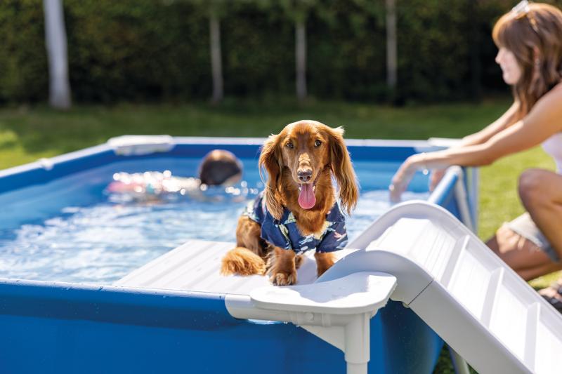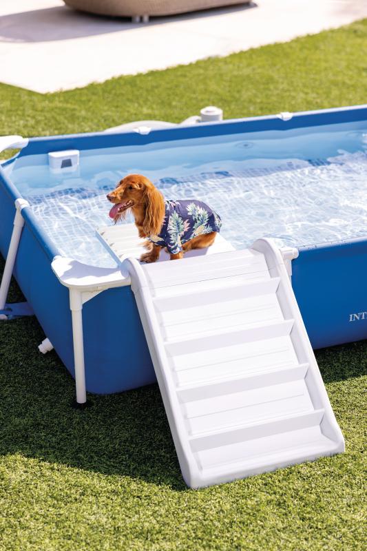 Tento obdélníkový bazén je navržený speciálně pro domácí mazlíčky, kteří ocení nejen osvěžení, ale i pohodlný přístup díky praktické rampě s odpočinkovou plošinou na jedné straně.