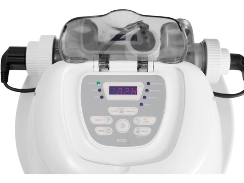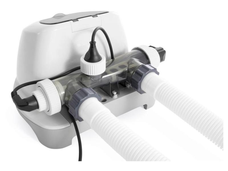 Chlorinátor s integrovaným systémem elektolýzy soli redukuje potřebné množství chlóru až o 70 %. Vhodný pro všechny nadzemní bazény Intex i jiné do objemu vody 26,5 m2
