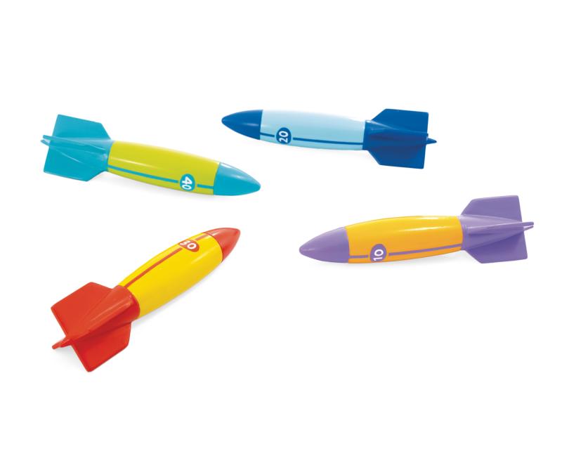 Sada 4 barevných torpéd z měkkého materiálu pro potápění do vzdálenosti až 6 metrů, vhodná pro děti od 6 let a společnou zábavu ve vodě. zobrazit celý popis