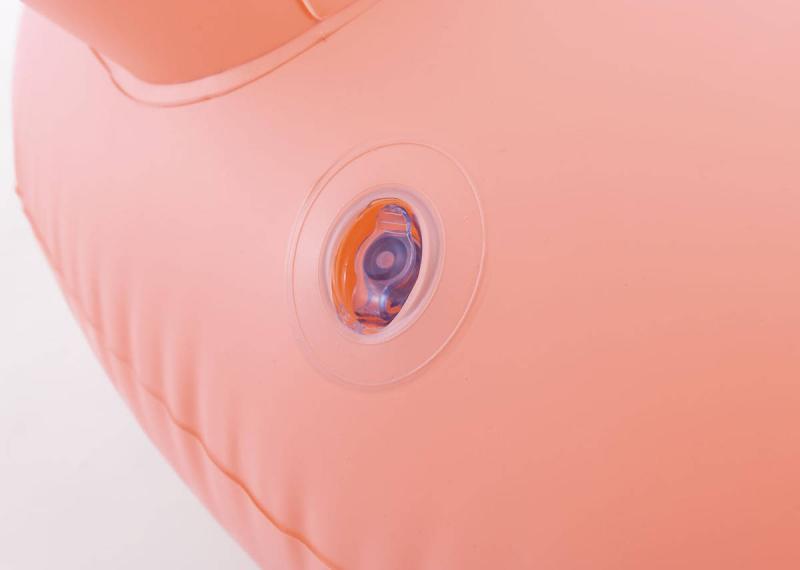 Křeslo disponuje robustním opěradlem, které podpírá záda, hlavu i ruce, což umožňuje uživateli maximální komfort během odpočinku. Sedací část je tvořena jemnou síťkou, která umožňuje příjemné ochlazení a zároveň zajišťuje dostatečnou cirkulaci vody, což přispívá ke zvýšení komfortu při dlouhodobém používání. Křeslo je vyrobeno z kvalitního a odolného vinylového materiálu, který je odolný vůči vodě i mechanickému poškození. Jeho hladký povrch je příjemný na dotek a snadno se udržuje. K nafukovacímu křeslu jsou připevněná dvě pevná madla na bocích, která usnadňují manipulaci s křeslem ve vodě i při přenášení. Madla jsou ergonomicky tvarovaná a pevně připevněná, aby zajistila bezpečné držení. Nafukovací ventil je umístěn na boční straně křesla a je snadno přístupný, což usnadňuje rychlé nafouknutí a vypuštění vzduchu. Celkový tvar křesla je ergonomicky navržený tak, aby poskytoval stabilitu na vodní hladině a pohodlné sezení.