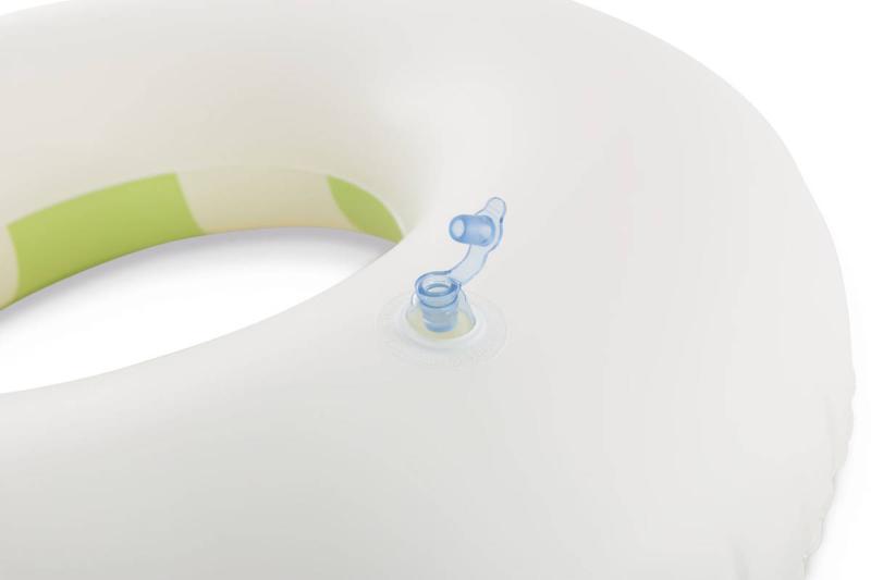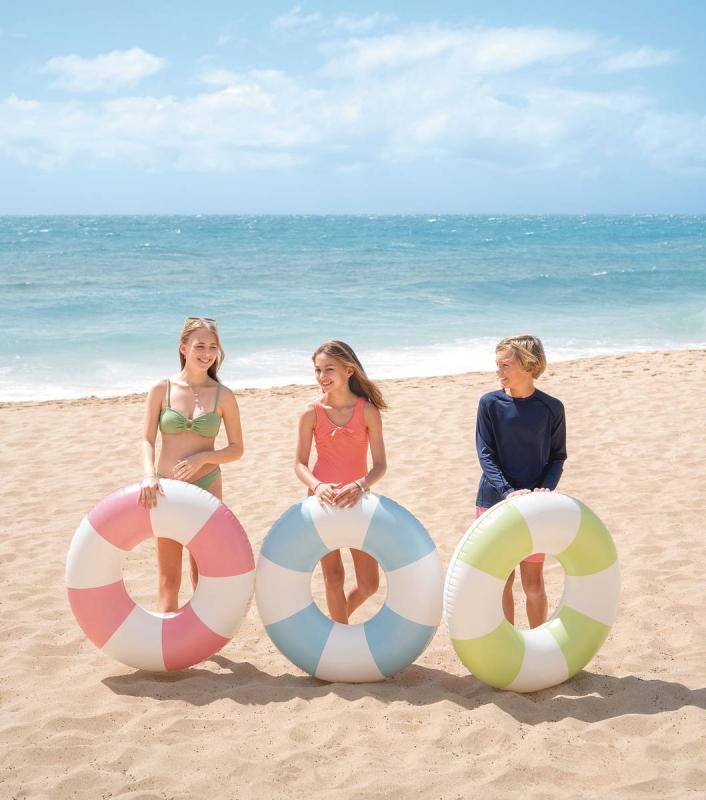 Tento kruh má průměr 91cm, což zajišťuje dostatečnou velikost pro pohodlné použití jak v bazénech, tak při pobytu u moře. Díky svému designu v pruhovaných pastelových barvách – modré, zelené a růžové – působí svěže a stylově, což je podtrženo jemným leskem materiálu. Kruh je vyroben z kvalitního, odolného PVC materiálu, který je pevný a zároveň pružný, což zaručuje dlouhou životnost a bezpečné použití. Povrch je hladký a příjemný na dotek, bez ostrých hran, což přispívá k pohodlnému a bezpečnému držení. Nafukovací ventil umožňuje snadné a rychlé nafouknutí i vyfouknutí, přičemž zajišťuje pevné uzavření, aby nedocházelo k úniku vzduchu během používání. Design kruhu je nejen estetický, ale také funkční – jeho výrazné pruhy usnadňují viditelnost ve vodě, což přispívá k bezpečnosti uživatele. Tento pruhovaný kruh je vhodný nejen pro děti, ale díky svému rozměru a kvalitě i pro mladší dospělé, kteří hledají jednoduchý a spolehlivý plovák. Je lehký a snadno přenosný, ideální pro rodinné výlety k vodě, na pláž nebo k bazénu.