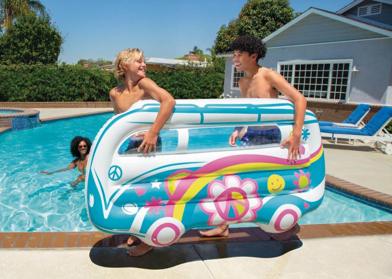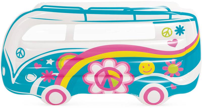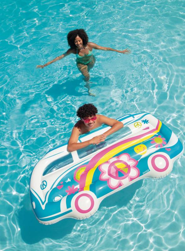 Tato stylová nafukovací matrace ve tvaru auta s barevným, hravým Hippie motivem a průhlednými okny je perfektním doplňkem pro hraní, plavání i odpočinek v bazénu nebo na pláži. Plavte stylově na vodě s nafukovací matrací Intex Groovy Van Float!