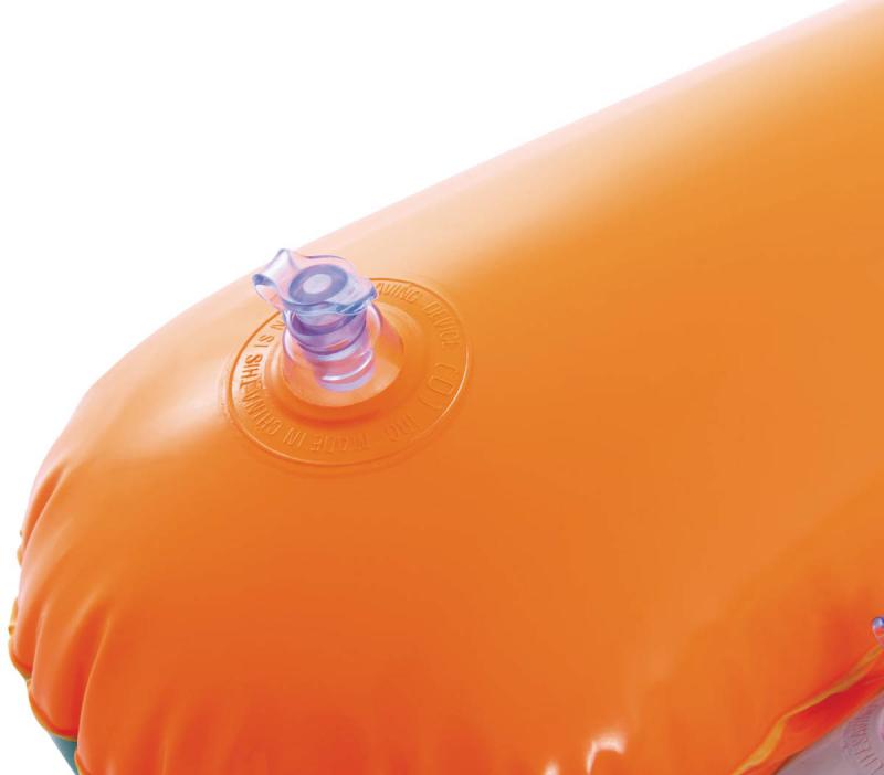 Povrch lehátka je vyroben z kvalitního PVC materiálu, který je odolný a zároveň příjemný na dotek. Sedací část je průhledná, což umožňuje dětem sledovat vodní svět pod sebou, což zvyšuje zážitek z pobytu ve vodě. Lehátko má tvar připomínající malý člun s rozšířenou přední částí a dvěma nafukovacími bočnicemi, které zajišťují stabilitu a pohodlí při plavání. Na obou stranách jsou umístěna dvě pevná plastová madla, která dětem usnadňují držení a zvyšují pocit bezpečí při pohybu ve vodě. Madla jsou ergonomicky tvarovaná a pevně připevněná k povrchu lehátka, což umožňuje snadnou manipulaci i během plavání nebo relaxace. Ventily pro nafukování jsou vybaveny bezpečnostními uzávěry, které zabraňují nechtěnému úniku vzduchu, což zajišťuje dlouhodobou stabilitu a pevnost. Sedací plocha lehátka je nafukovací a má ergonomický tvar s podélnými vzduchovými komorami, které zvyšují komfort a umožňují lepší rozložení váhy dítěte. Díky kombinaci pevné a průhledné části je lehátko nejen funkční, ale také vizuálně atraktivní.