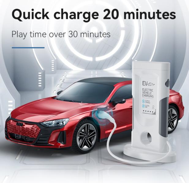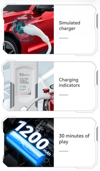 RC auto je vybaveno integrovaným akumulátorem 3,7 V 1200 mAh, díky kterému si užijete spoustu zábavy po cca 30 minut. Velmi originální je nabíječka, která vypadá jako stojan pro nabíjení elektromobilů. Pomocí kabelu ji zapojíte do USB adaptéru a pomocí druhého do RC auta. Stačí jen otevřít ,,víčko nádrže,, a můžete nabíjet. Navíc je nabíjecí stojan vybaven světelnou signalizací, takže přesně vidíte vývoj nabíjení, které trvá cca 30 minut.