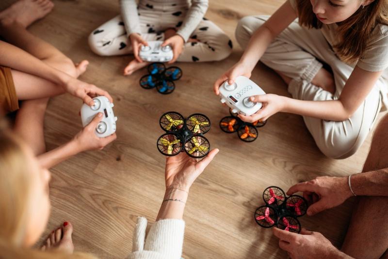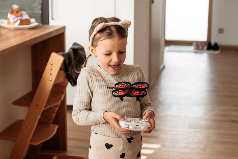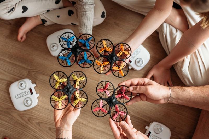Dron je vhodný pro použití jak v interiéru, tak venku, a je dostupný ve čtyřech barevných variantách vrtulí: modré, žluté, oranžové a růžové.