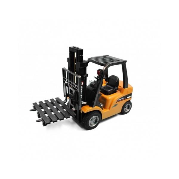 Rám kabiny, vidlice a rameno s nakládacím hákem jsou vyrobeny z kvalitního kovu, což zajišťuje vysokou odolnost a stabilitu během provozu. Další části jsou zhotoveny z ekologického a odolného ABS plastu, zatímco pneumatiky jsou vyrobeny ze skutečné gumy, což přispívá k lepší přilnavosti a věrnosti pohybu.