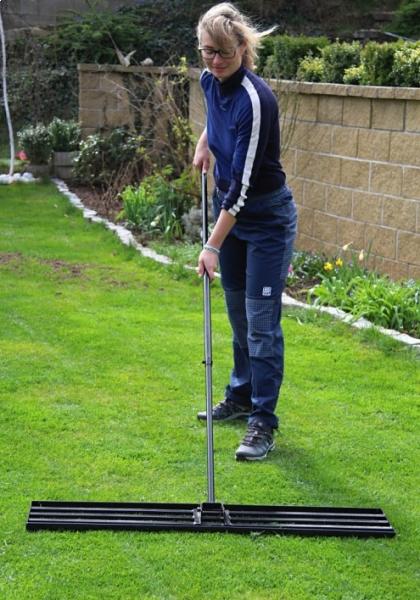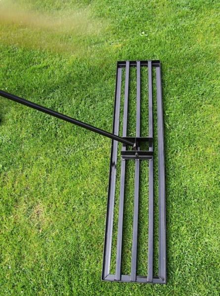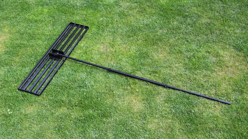 Nivelační hrábě, brána 115cmOcelova nivelační brána pro zapravení písku do vašeho trávníku při aerifikaci. Sloužit může dobře i při topdressingu nebo jen vyrovnávání terénu. Pomocí tohoto nástroje dosáhnete dokonale rovného trávníku. Včetně 183cm násady, černá barva. Rozměr základny 115x25cm