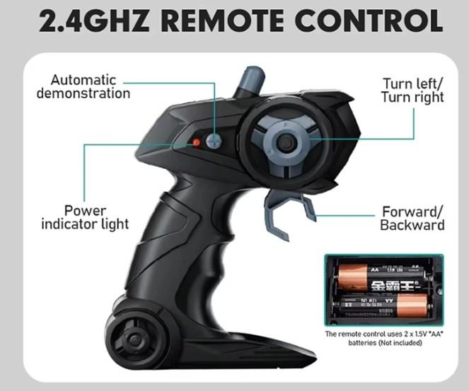 Ovládač má pištoľový tvar a je vyrobený z príjemného soft plastu, čo uľahčuje ovládanie najmä deťom s menšími rukami. Intuitívne volantové riadenie a tlačidlo pre prednastavenú DEMO verziu umožňujú jednoduché ovládanie a predvedenie všetkých funkcií modelu. Dosah ovládania je cez 25 metrov, čo umožňuje voľný pohyb bez obmedzenia signálu.