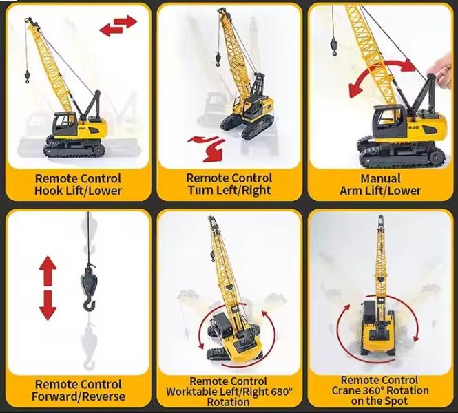 Tento menší RC model jeřábu zvládne přesouvat předměty do hmotnosti 100 g pomocí háku. Každý pás se ovládá samostatně, což umožňuje otáčení na místě o 360°. Kabinu lze otáčet až o 680°, což zajišťuje přesné umístění břemene. Jeřáb je možné složit do rozměrů 37,5 cm na výšku, 10 cm na šířku a 17 cm na délku. Stejně jako bagr, i kabina je vybavena LED osvětlením. Výdrž na jedno nabití je přibližně 20 minut.