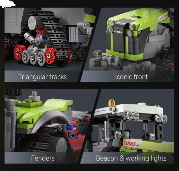Stavebnice představuje detailně zpracovaný model pásového traktoru Xerion-5000 v přesném měřítku 1/32, který nese oficiální licenci výrobce zemědělských strojů Claas.