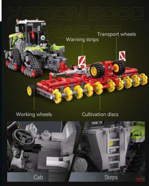 Model obsahuje 1336 dílků a je vybaven řadou realistických detailů, jako jsou trojúhelníkové pásy, blatníky, výstražné proužky, majáky, pracovní světla, boční zrcátka a přední protizávaží. Součástí jsou také pracovní i transportní kola a kultivační kotouče, které doplňují zemědělské příslušenství traktoru.