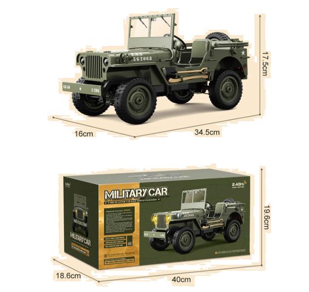 Detailná replika vojenského auta Willys v mierke 1/10 s pištoľovým ovládačom, vymeniteľným Li-ion akumulátorom a dosahom až 50 metrov.Tento RC model predstavuje presnú a funkčnú repliku vojenského auta Willys v mierke 1/10, ktorá poteší každého nadšenca do modelov i diaľkovo ovládaných vozidiel.