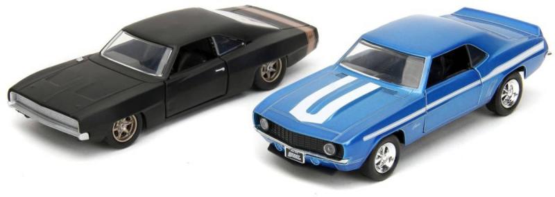 Kovové modely aut z filmu Rychle a zběsile ve dvojbalení - Chevrolet Camaro 1969 a Dodge Charger Wide Body 1968, volnoběh, otevírací dveře, měřítko 1:32, velikost 13 cm. Wave 2/1.