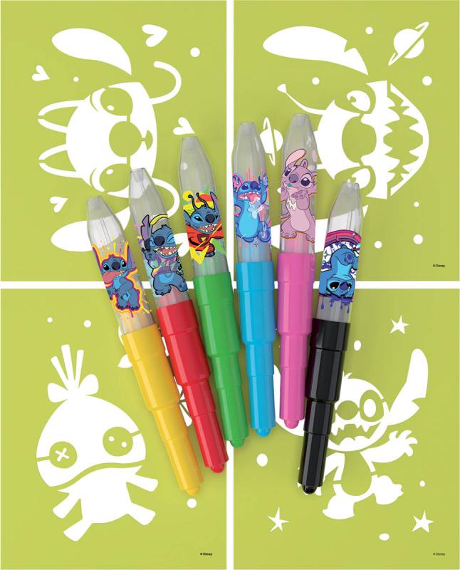 JIRI MODELS Fixy foukací 6ks Lilo & Stitch set se 4 šablonami.Kreativní sada obsahující 6 barevných foukacích fixů a 4 barevné papírové šablonky v oblíbených pohádkových motivech. Děti se s touto sadou mohou pustit do obrázků vytvářených technikou foukání,