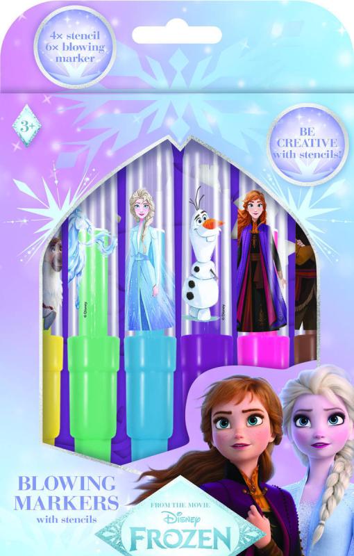 Balení obsahuje 6 barevných foukacích fixů s potiskem a 4 barevné papírové šablonky v oblíbených motivech.