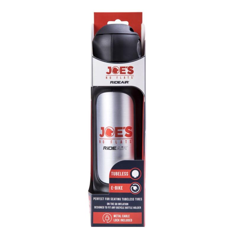Joe’sRideAir je prenosná multifunkčná kapsľa, ktorá umožní nafúkať plášť jediným stlačením tlačidla. Pre jazdcov používajúcich bezdušový systém kapsľa umožňuje nahustiť plášť bez nutnosti vlastniť kompresor alebo navštíviť čerpaciu stanicu pre prvotné nahodenie plášťa. Presná veľkosť do košíka na fľašu navyše umožňuje kapsľu pohodlne prevážať so sebou.