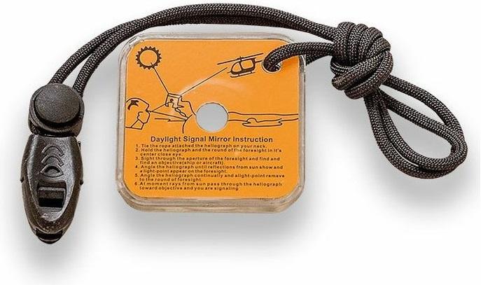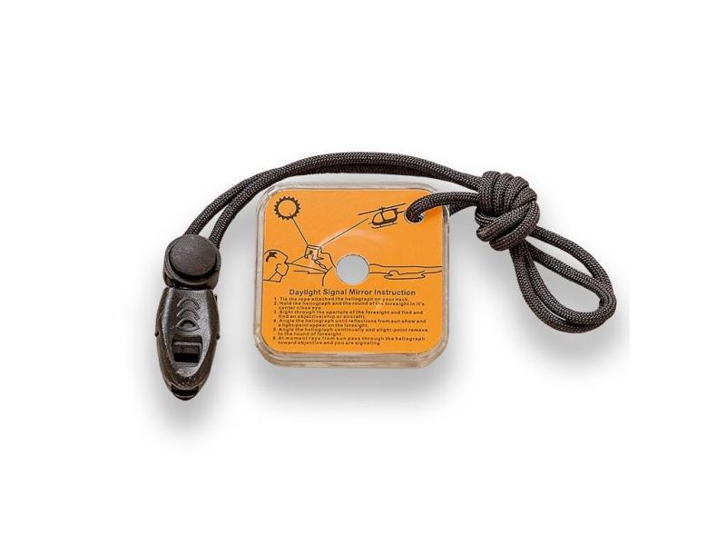 -součástí balení je signální zrcátko se závěsnou šňůrkou, nouzová píšťalka umístěná na závěsné šňůrce a náhradní paracord o délce 2 metry