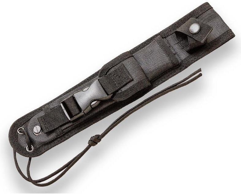 -čierne nylonové puzdro s pútkom pre horizontálne upevnenie k opasku alebo batohu, rozšíriteľnou kapsou s plastovou sponou na doplnky a paracord šnúrkou