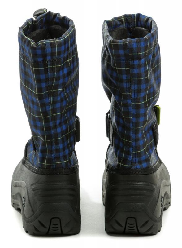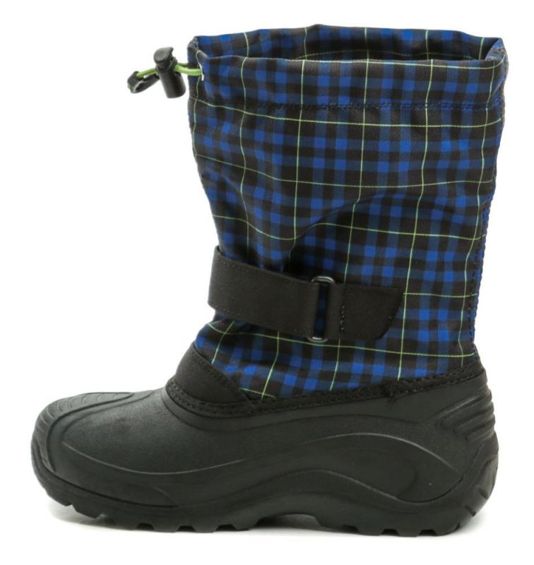Dětská zimní vyteplená nepromokavá obuv s utahováním na gumovou tkanici se zdrhovadlem a se zapínáním na suchý zip kolem kotníku.