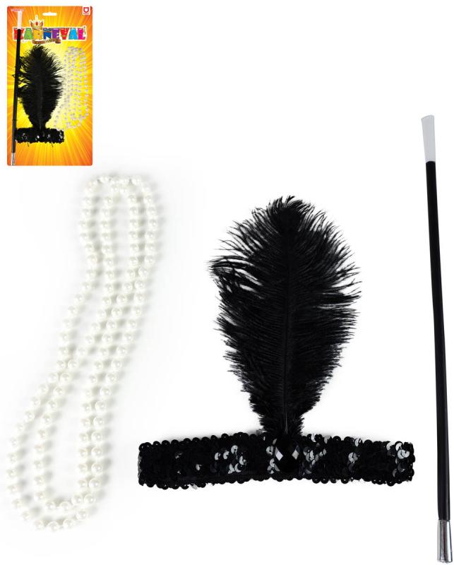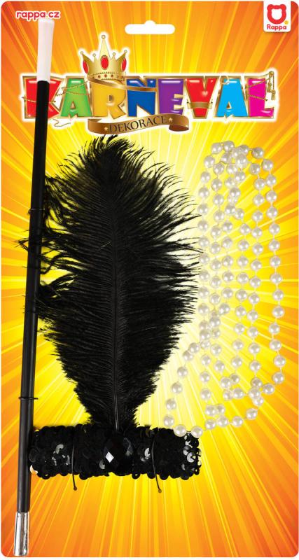 KARNEVAL Charleston čelenka s peřím set s korálemi a cigaretovou špičkou