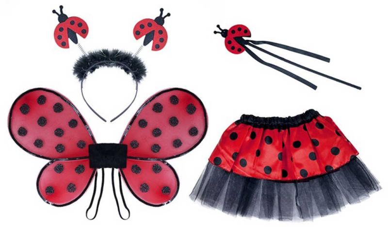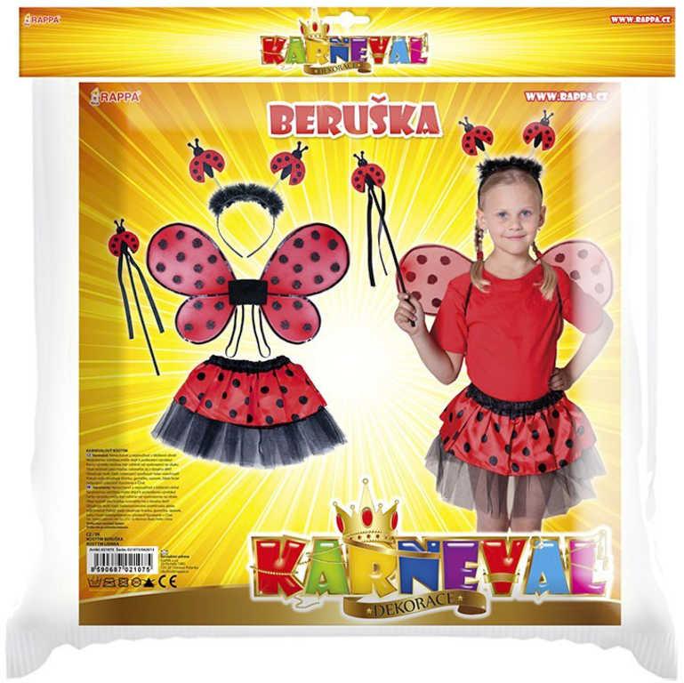 Roztomilý karnevalový kostým s motivem berušky je určen pro holčičky ve věkovém rozmezí 3-10 let. Tento kostýmek má červenou sukničku s puntíky, která je doplněna černou tylovou spodničkou. Dále obsahuje čelenku s peřím a beruškami, křídla na gumičku a hůlku. Celková délka sukýnky je cca 27cm.