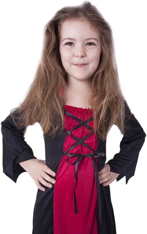 Dlouhé šaty Morgana v kombinaci černá/bordó jako doplněk ke kostýmu čarodějnice, na karneval.Roztomilý karnevalový kostým s motivem čarodějky udělá radost každé holčičce! Souprava obsahuje pouze šaty, koště není součástí balení. Set ve velikosti S je určen pro holčičky ve věkovém rozmezí 4-6 let. Staň se nejhezčí čarodějnicí karnevalu díky tomuto kostýmu! Vhodný i na oslavu Halloweenu.