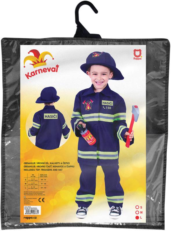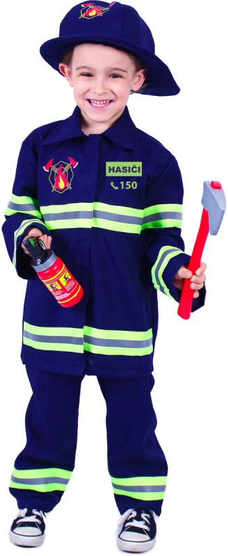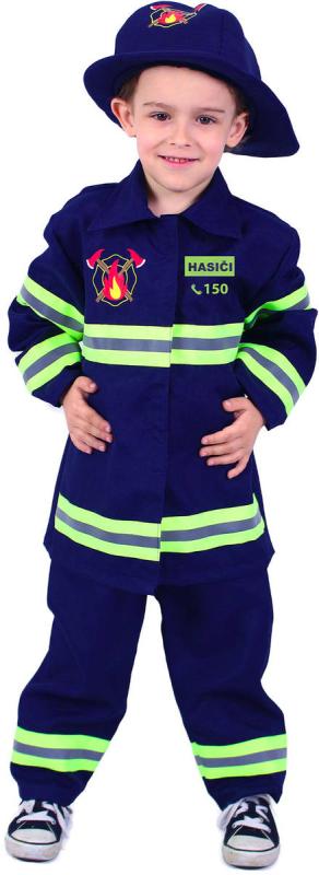 Český hasič. Šaty (kostým) na karneval. Součástí vrchní díl, kalhoty, čepice - helma. Věk 8 - 10 let, výška postavy 128 - 140cm, velikost L.Který z chlapců by se nechtěl v dětství stát hasičem? S tímto exkluzivním dětským kostýmem se v něj proměníte během chvilky! Sada obsahuje blůzu s nápisem HASIČI, kalhoty a čepici.