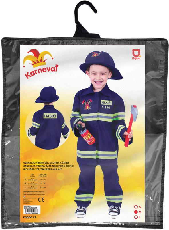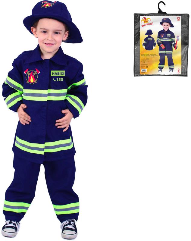 Český hasič. Šaty (kostým) na karneval. Součástí vrchní díl, kalhoty, čepice - helma. Věk 6 - 8 let, výška postavy 117 - 128cm, velikost M.Který z chlapců by se nechtěl v dětství stát hasičem? S tímto exkluzivním dětským kostýmem se v něj proměníte během chvilky! Sada obsahuje blůzu s nápisem HASIČI, kalhoty a čepici.