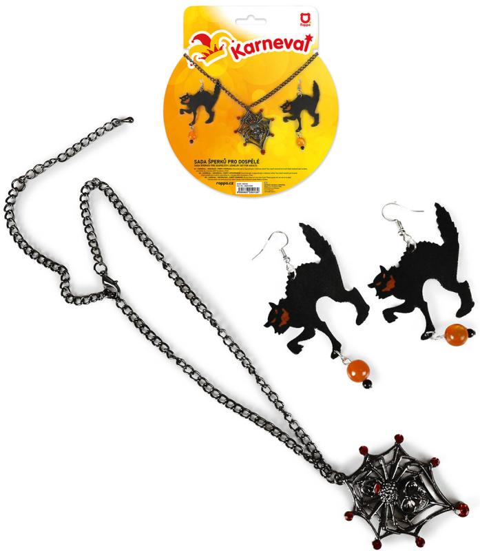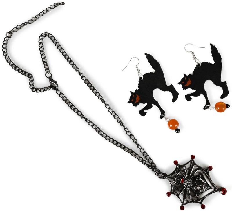 Sada šperků - součástí náhrdelník a náušnice Kočka. Vhodné jako doplněk na Halloween party nebo ke karnevalovému kostýmu.Doplňte svůj strašidelný outfit touto tajemnou sadou šperků, která je jako stvořená pro Halloween nebo oslavu čarodějnic! Sada obsahuje elegantní náhrdelník s detailně zpracovaným pavoukem, který dodá vašemu vzhledu temnou eleganci, a náušnice s mystickými kočkami, jež jsou symbolem magie a tajemství.