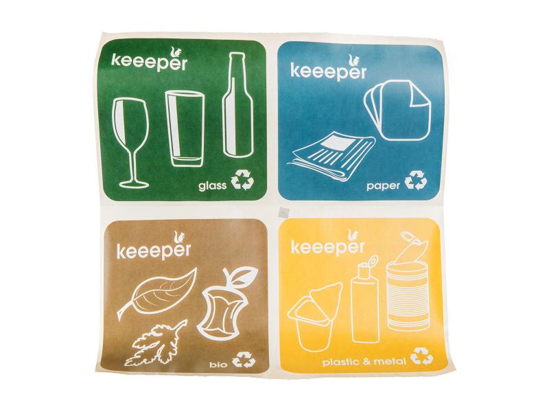 Součástí balení jsou také praktické nálepky na třídění odpadu, které označují jednotlivé druhy: sklo, papír, bio a plast + kov. Díky nim lze koš snadno zařadit do systému recyklace a přispět tak k lepší ekologii.