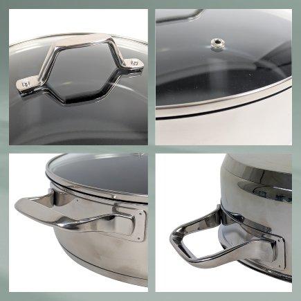 Servírovací pánev z nerezové oceli 18/10 s poklicí, vhodná na všechny typy sporáků včetně indukce, objem 4 l a průměr 28 cm pro větší porce. Zobrazit celý popis