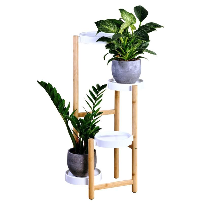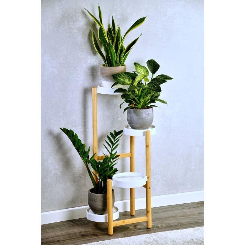 Elegantní stojan na květiny KESPER z FSC® certifikovaného bambusu je skvělým řešením pro milovníky rostlin, kteří chtějí své květiny stylově vystavit. Díky čtyřem bílým lakovaným policím nabízí dostatek prostoru pro čtyři rostliny o průměru až 20 cm. Bambusová konstrukce zajišťuje vysokou stabilitu a dlouhou životnost. Stojan se hodí do obývacího pokoje, na balkon nebo terasu a díky svému minimalistickému designu zapadne do jakéhokoli interiéru. Ideální volba pro všechny, kteří hledají funkční a estetické řešení pro své rostliny.• Hlavní výhody stojanu na květiny: