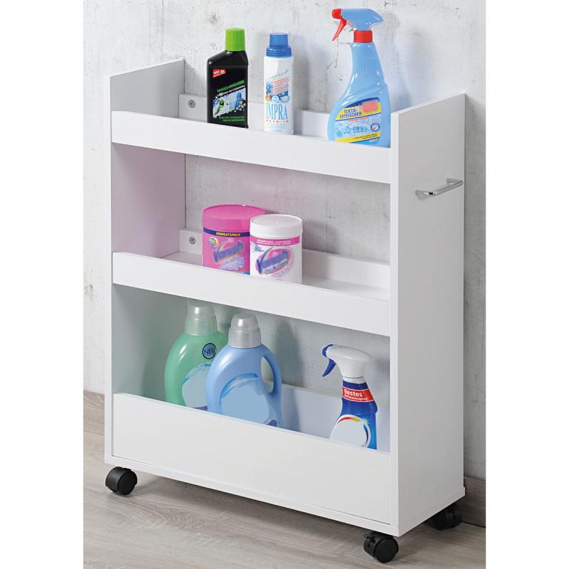 Police do výklenku na kolečkách přináší řád na čtyřech kolech. Tato bílá police je ideálním řešením pro přidání úložného prostoru v domácnosti. Tři velké police poskytují dostatek místa pro uložení koření, olejů, těstovin nebo jakýchkoliv jiných předmětů, které potřebují organizaci.Díky praktické kovové rukojeti a čtyřem otočným kolečkům je police velmi snadno přemístitelná. Dvě z koleček jsou vybavena parkovacími brzdami, aby police zůstala stabilní na svém místě. Snadná konstrukce a moderní design umožňují využití této police nejen v kuchyni, ale také v obývacím pokoji, ložnici nebo jiných obytných prostorech, kde může sloužit k uspořádání knih, dekorací nebo každodenních potřeb.