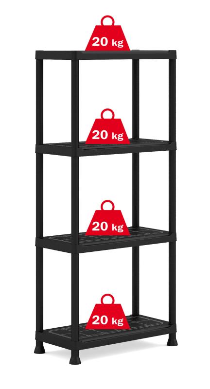 Bezúdržbový regál pro multifunkční využití v garážích, dílnách i domácnosti, 4 poličky, nosnost jedné police 20 kg, zvýšené nožičky pro snadné čištění podlah, vysoká odolnost. Policový spojovací systém. Černá.Zorganizujte si nářadí a náčiní na zahradu v garáži, ve sklepě nebo v jakékoliv jiné místnosti, kde chcete mít větší přehled o svých věcech. Bezúdržbový Keter Plus Shelf 60/4 je z pevného a odolného materiálu a každá z jeho polic unese až 20 kg, díky kterému se hodí do různých míst ve vaší domácnosti a převážně dílny. Na poličkách najdete mnoho prostoru pro vaše nářadí, věci na zahradu nebo třeba zásoby do kuchyně, například mouky a cukru. Zvýšené nožičky usnadní úklid pod regálem.