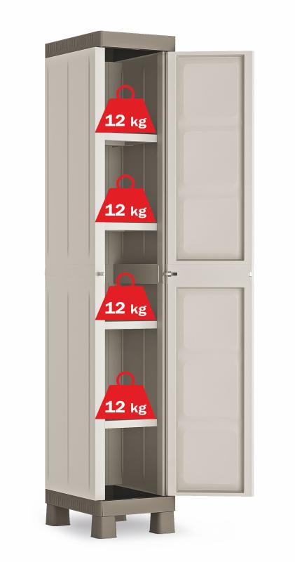 Skříň obsahuje celkem 4 přídavné police - každá s výraznou nosností až 12 kg, které přijdou vhod pro výrazně těžší předměty všeho druhu. Lze ji tedy využít pro skladování dílenského nářadí či zahradnických potřeb, kdy přijde vhod pro uložení náčiní s dlouhou násadou, které by se jinam nevešlo. Díky svému provedení v univerzální béžové barvě zapadne do každého prostoru bez ohledu na jeho konceptuální styl.Vysoká odolnost do každého prostředí