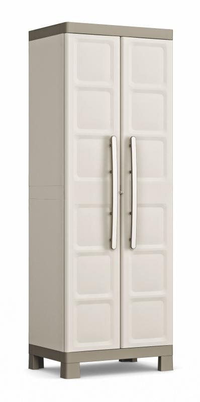 Bezúdržbová skříň pro využití v garážích, dílnách i domácnosti, snadná montáž 3 poliček, nosnost jedné police 10 kg, zvýšené nožičky pro snadné čištění podlah, možnost uzamčení, vysoká odolnost. Kvalitní plast. Béžová. Zobrazit celý popis