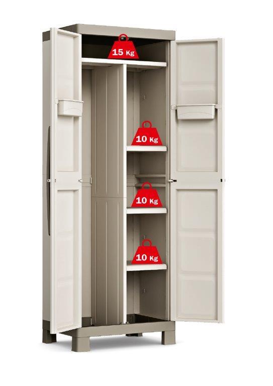 Skříň obsahuje celkem 3 přídavné police - každá s výraznou nosností až 10 kg, které přijdou vhod pro výrazně těžší předměty všeho druhu. Lze ji tedy využít pro skladování dílenského nářadí či zahradnických potřeb, kdy přijde vhod pro uložení náčiní s dlouhou násadou, které by se jinam nevešlo. Díky svému provedení v univerzální béžové barvě zapadne do každého prostoru bez ohledu na jeho konceptuální styl.Vysoká odolnost do každého prostředí
