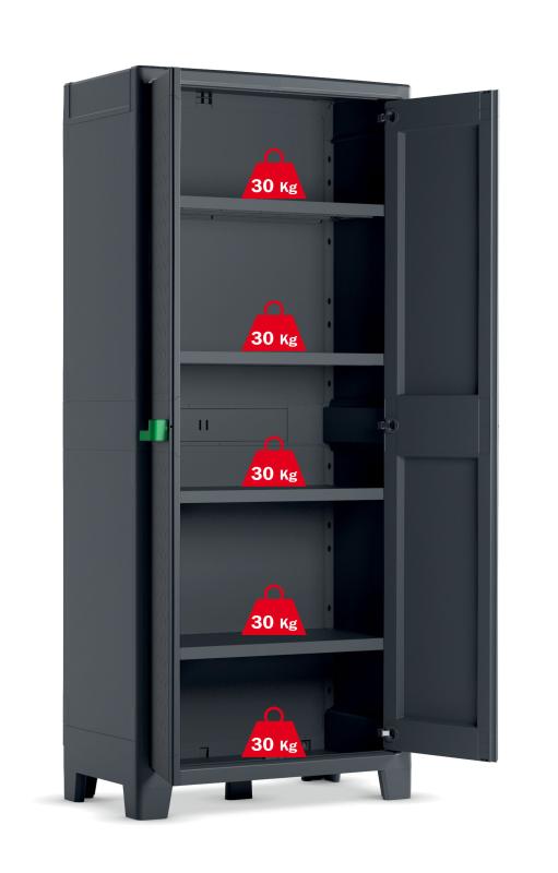Skříň obsahuje celkem 4 přídavné police - každá s nosností až 30 kg, které přijdou vhod pro výrazně těžší předměty všeho druhu. Lze ji tedy využít pro skladování dílenského nářadí či zahradnických potřeb, kdy přijde vhod pro uložení náčiní s dlouhou násadou, které by se jinam nevešlo.Vysoká odolnost do každého prostředí