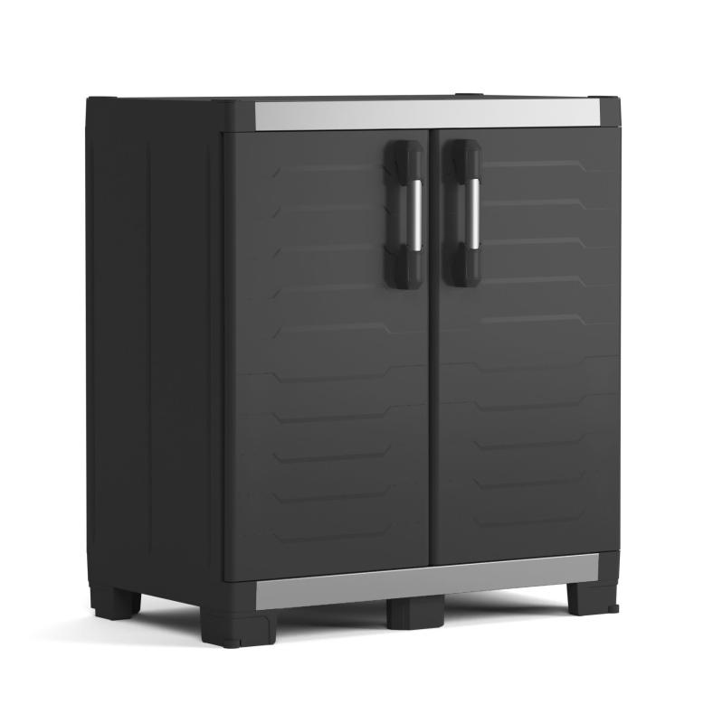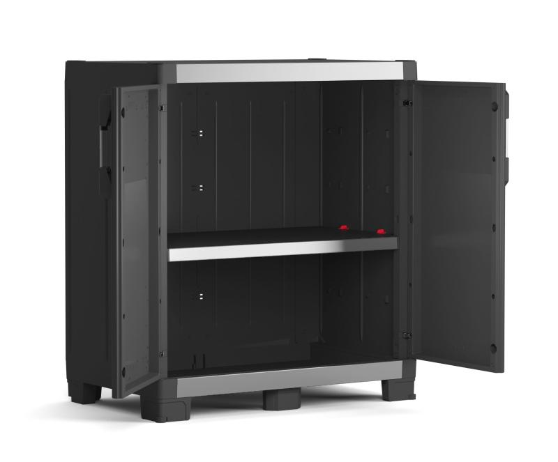 Bezúdržbová skříň pro využití v garážích a dílnách, snadná montáž 1 poličky o nosnosti 45 kg, zvýšené nožičky pro snadné čištění podlah, možnost uzamčení, vysoká odolnost. Kvalitní plast. Černá. Zobrazit celý popis