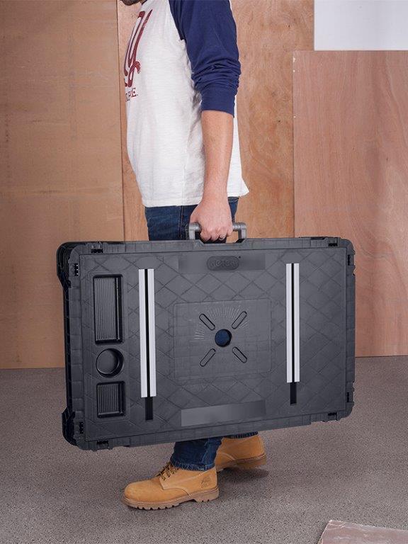 Tento přenosný stůl váží pouze 8,7 kg a přitom nosnost činí 453 kilogramů. Součástí jsou čtyři svorky, univerzální kovové kolejnice ve tvaru T a organizér na nářadí.