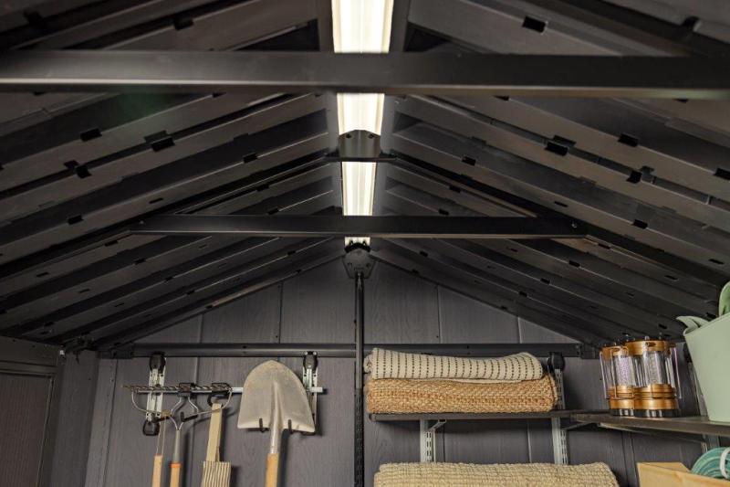 Díky ocelí zpevněné střeše a podlahovému panelu s nosností 150 kg/m² je domek ideálním řešením pro uložení těžších předmětů – například sekaček, zahradního nábytku či pytlů se substrátem. Domek je navržený tak, aby bez problému odolal i silnému větru do 145 km/h, pokud je správně ukotven.Promyšlené detaily pro maximální funkčnost