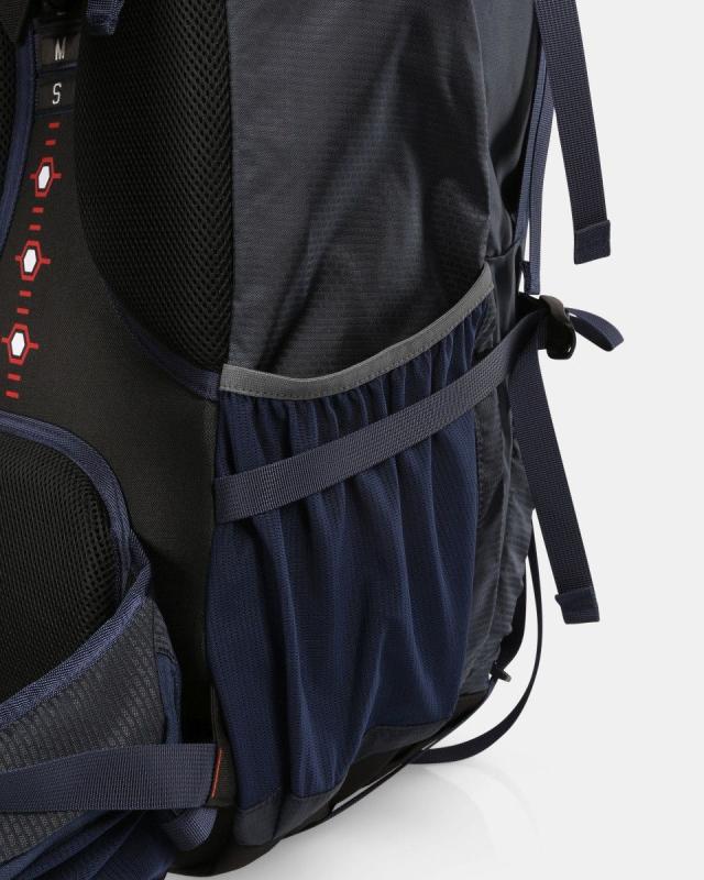 Na spodní části jsou popruhy na upevnění stanu, nebo karimatky; na bocích jsou poutka pro připevnění holí.