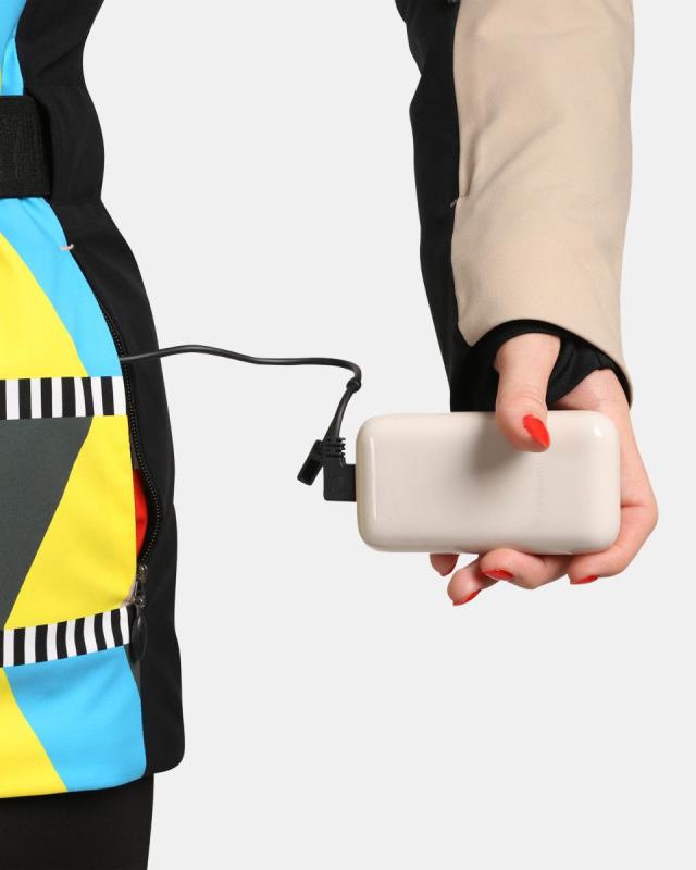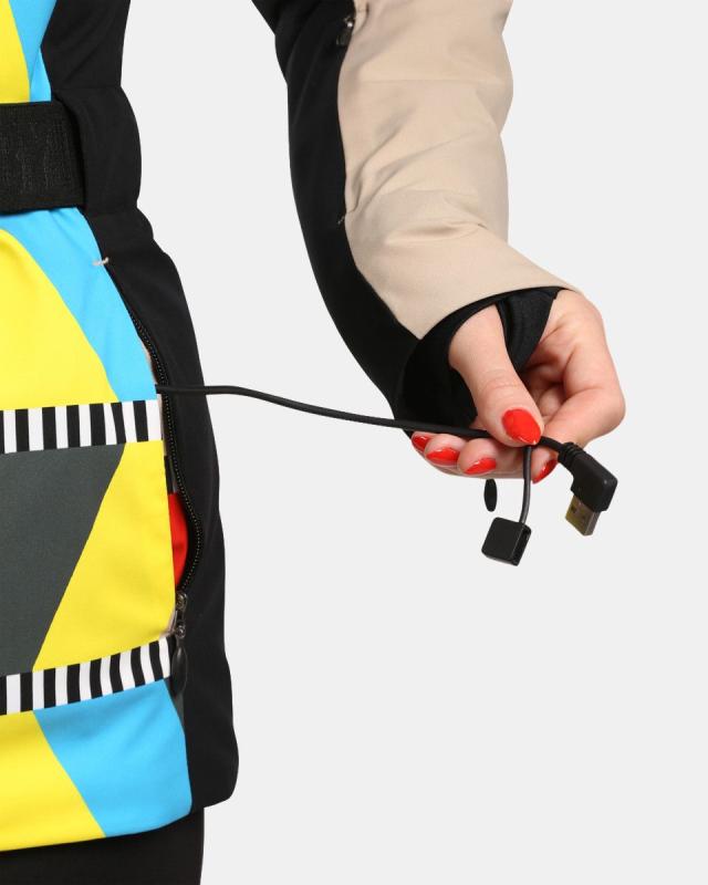 Integrovaný systém vyhřívání, ovládaný jednoduše pomocí tlačítka na paži. Stačí dlouze stisknout tlačítko a vybrat si ze tří teplotních režimů. Napájení pomocí powerbanky o síle 10 000 mAh do USB konektoru v kapse bundy. Topné panely jsou umístěny na zádech a na hrudníku. Materiál SIBERIUM s vodním sloupcem 10 000 mm/m2/24h a podlepené švy na ramenou a kapuci vás udrží v suchu i v nejnáročnějších podmínkách. Sportovní střih v kombinaci s elastickou podšívkou vám zaručí volnost při pohybu, syntetická výplň vás příjemně zahřeje. Odnímatelný protisněhový límec se silikonovým páskem proti vyhrnování, vás ochrání před vniknutí sněhu pod bundu. Detaily, jako je hebký mikrofleece uvnitř vysokého límce a odepínatelná kapuce s luxusní syntetickou kožešinou, dodávají bundě sportovní eleganci. Pásek s kovovou sponou vyzdvihne pas, zipy na rukávech a stahovadlo na spodním lemu bundy vám umožní přizpůsobit si bundu podle vašeho pohodlí. S rukávovou kapsou na skipass, vnitřní kapsou na brýle a zipovou kapsičkou na cennosti máte vše, co potřebujete, po ruce.Bunda má moderní celopotištěný design, který můžete kombinovat s našimi lyžařskými softshellovými kalhotami TORIEN-W. Buďte na svahu v pohodlí a přitom nepřehlédnutelní.