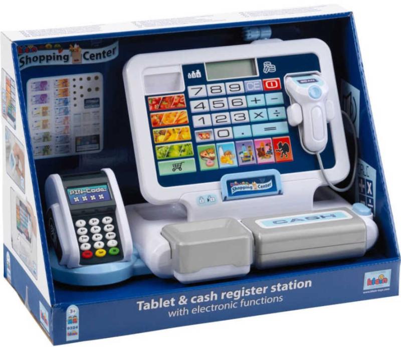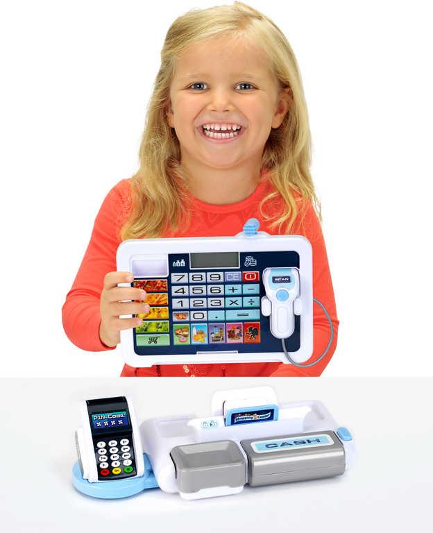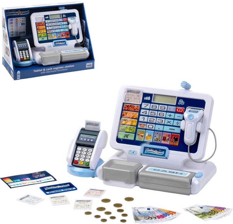 Pokladna pro děti, s platebním terminálem a odnímatelným tabletem. Hračka na baterie, se zvukem.Elektronický displej, zvukové efekty, kalkulačka s efekty, skener se zvukem, výklopná peněžní přihrádka s tlačítkem. Součástí balení jsou také dětské mince, bankovky, 6 účtenek a kreditní karta.