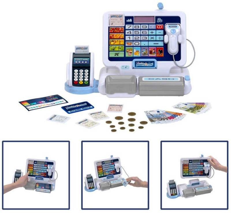 Elektronický displej, zvukové efekty, kalkulačka s efekty, skener se zvukem, výklopná peněžní přihrádka s tlačítkem. Součástí balení jsou také dětské mince, bankovky, 6 účtenek a kreditní karta.