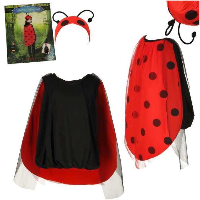 Kostýmberuška pro děti je roztomilé oblečení pro různé příležitosti - tematické večírky, hry nebo Halloween. Sada obsahuje černé šaty s červenou pláštěnkou pokrytou černými tečkami a klobouk s tykadly. Kostým je vhodný pro děti vysoké 100-110 centimetrů.