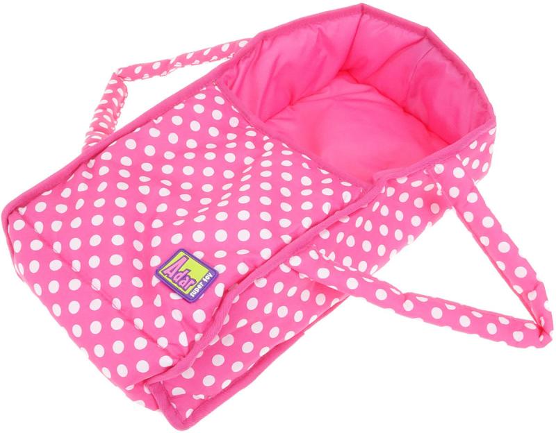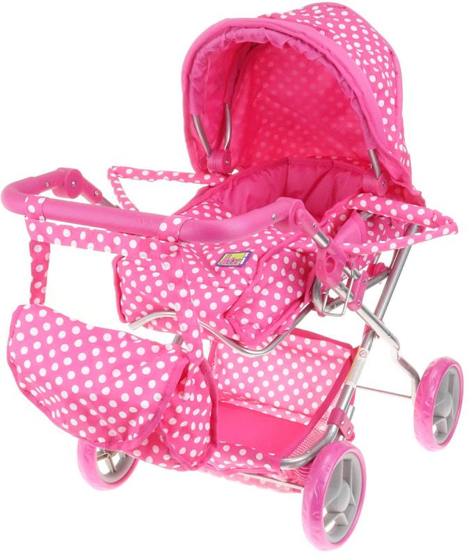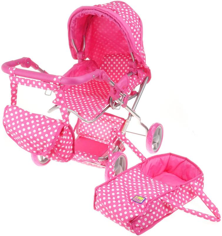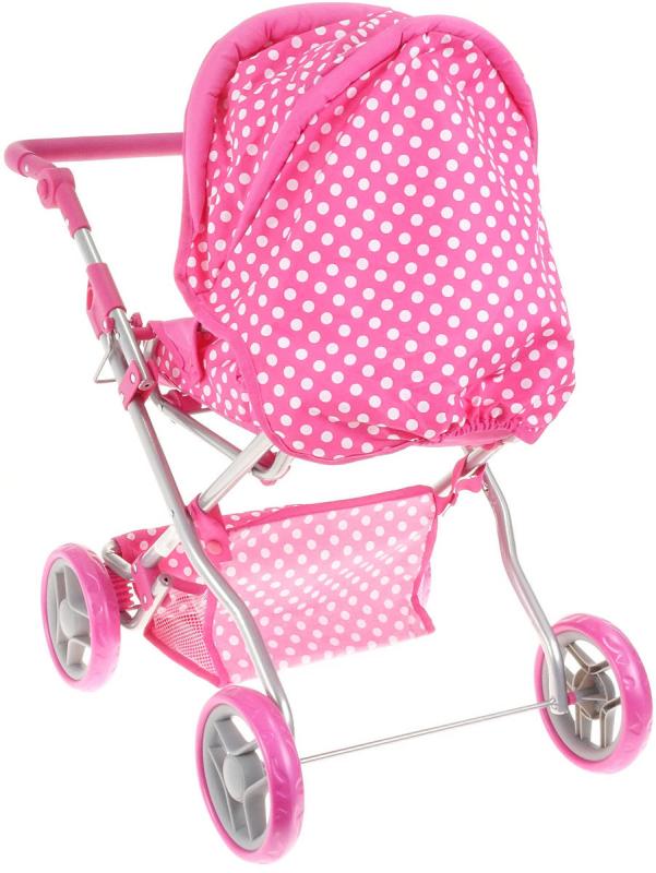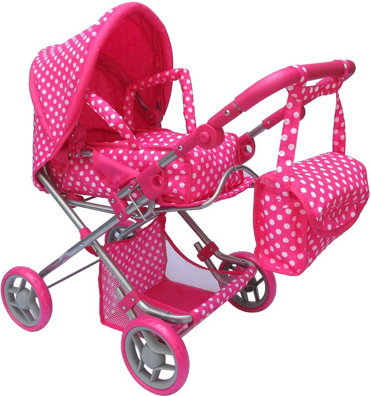 Hluboký dětský kočárek pro panenku - miminko. Růžový s bílými puntíky. Součástí příruční taška na madlo.