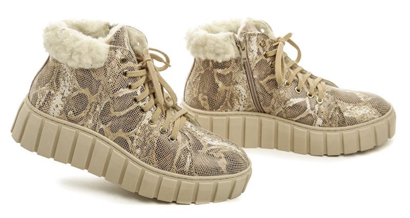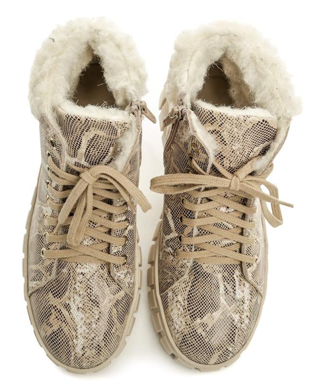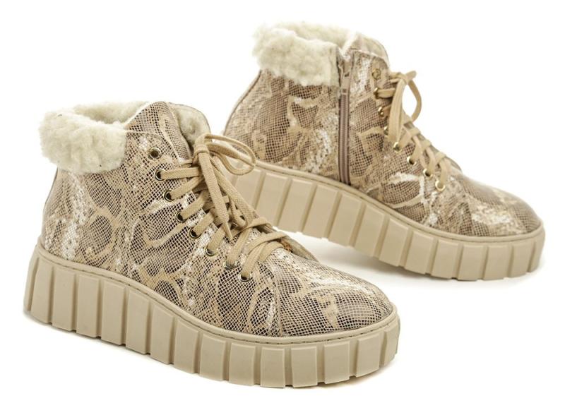 Dámská zimní kotníčková vycházková obuv na šněrování i zip na vysoké podešvi.